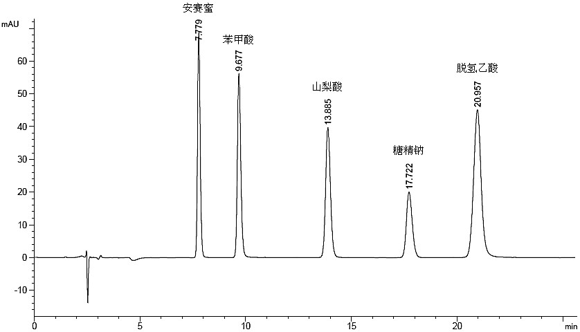 安賽蜜、苯甲酸、山梨酸、糖精鈉和脫氫乙酸五種防腐劑的同時檢測